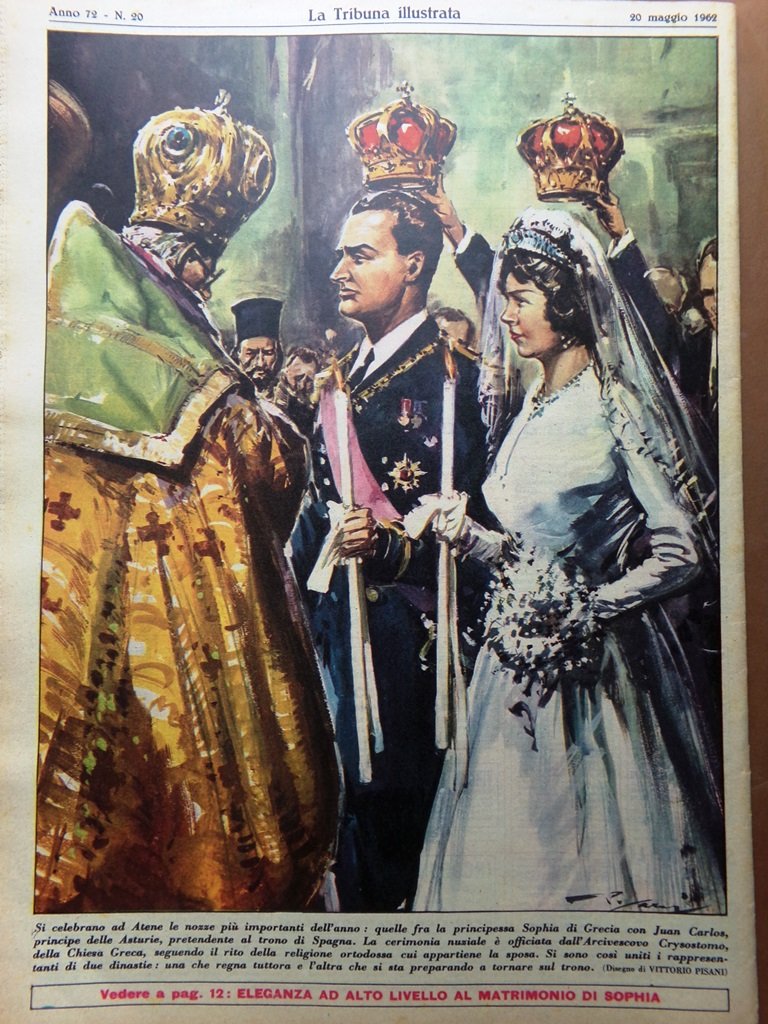 Si celebrano ad Atene le nozze più importanti dell'anno: quelle fra la principessa Sofia di Grecia con Juan Carlos, principe delle Asturie, pretendente al trono di Spagna. La cerimonia nuziale è officiata dall'Arcivescovo Crysostomo, della Chiesa Greca, seguendo il rito della religione ortodossa cui appartiene la sposa. Si sono così uniti i rappresentanti di due dinastie: una che regna tuttora e l'altra che si sta preparando a tornare sul trono (disegno di Vittorio Pisani)