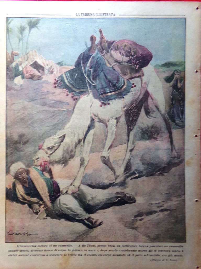 L'improvvisa collera di un cammello. A Bu-Thadi, presso Sfax, un coltivatore faceva pascolare un cammello quando questo lo gettava in terra e dopo averlo morso gli si coricava sopra uccidendolo (disegno di E. Asso)