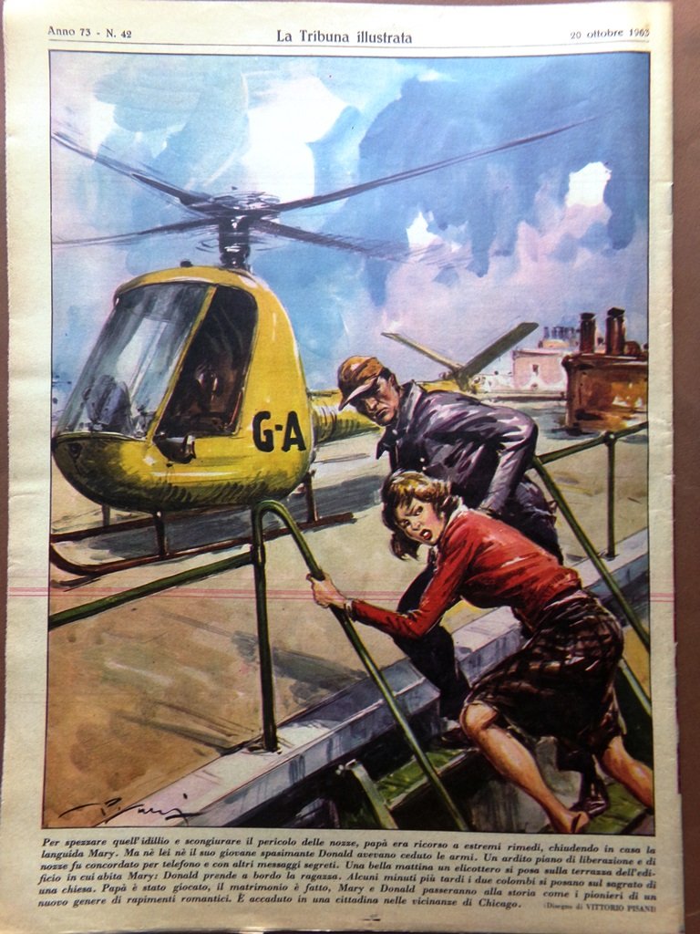 Per spezzare quell'idillio e scongiurare il pericolo delle nozze, papà era ricorso a estremi rimedi, chiudendo in casa la languida Mary. Ma né lei né il suo giovane spasimante Donald avevano ceduto le armi. Un ardito piano di liberazione e di nozze fu concordato per telefono e con altri messaggi segreti. Una bella mattina un elicottero si posa sulla terrazza dell'edificio in cui abita Mary: Donald prende a bordo la ragazza. Alcuni minuti più tardi i due colombi si posano sul sagrato di una chiesa. Papà è stato giocato, il matrimonio è fatto, Mary e Donald passeranno alla storia come i pionieri di un nuovo genere di rapimenti romantici. È accaduto in una cittadina nelle vicinanze di Chicago (disegno di Vittorio Pisani)