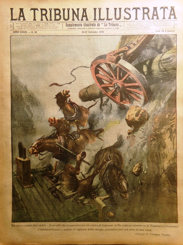 Un carro caduto dal cielo! I cavalli che trasportavano un carico di legname, nella regione montuosa di Vancouver (Canada) s'imbizzarrivano e, saltato il ciglione della strada, precipitavano sul tetto di una casa (disegno di Vittorio Pisani)