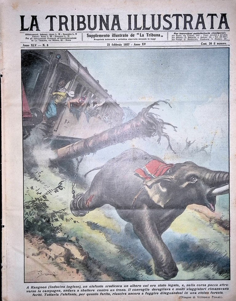 A Rangoon (Indocina inglese) un elefante sradicava un albero cui era stato legato, e, nella corsa pazza attraverso la campagna, andava a sbattere contro un treno. Il convoglio deragliava e molti viaggiatori rimanevano feriti. Tuttavia l'elefante, per quanto ferito, riusciva ancora a fuggire dileguandosi in una vicina foresta (disegno di Vittorio Pisani)