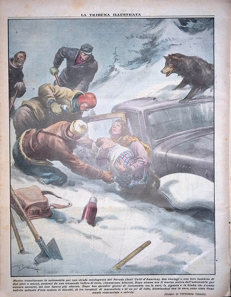 Mentre transitavano in automobile per una strada montagnosa del Nevada (Stati Uniti d'America), due coniugi e una loro bambina di due anni e mezzo, sorpresi da una tremenda bufera di neve, rimanevano bloccati. Dopo alcune ore il marito usciva dall'automobile per cercare soccorsi, ma non faceva più ritorno. Dopo ben quindici giorni di isolamento tra le nevi, la signora e labimba che s'erano nutrite soltanto d'una scatola di biscotti, di tre barattoli di marmellata e di un po' di latte, dissetandosi con la neve, sono state finalmente rintracciate e salvate (disegno di Vittorio Pisani)