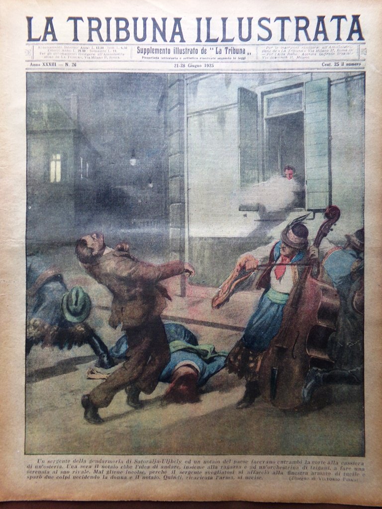 Un sergente della gendarmeria di Satoralja-Uljhely e un notaio del paese facevano entrambi la corte alla cassiera di un'osteria. Una sera il notaio ebbe l'idea di andare insieme alla ragazza e a un'orchestrina di tzigani a fare una serenata al suo rivale. Ma il sergente sparò alla donna e al notaio e poi si uccise (disegno di Vittorio Pisani)