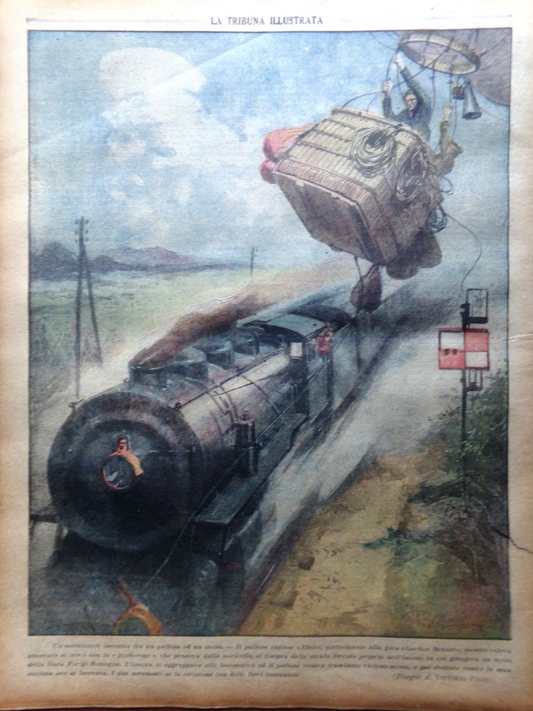 Eccezionale incontro tra un pallone e un treno. Il pallone inglese "Elsie" partecipante alla gara "Gordon Bennet" si trovò sulla strada ferrata sulla traiettoria del treno al quale fortuitamente si attaccava andando a schiantarsi sulla massicciata. Solo feriti i due aeronauti (disegno di Vittorio Pisani)
