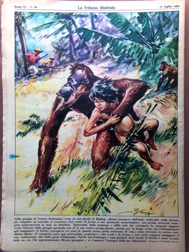 Nella giungla di Celebes (Indonesia) come in una favola di Kipling. Alcuni cacciatori dell'isola, inoltratisi nella foresta per inseguire un animale, si trovavano d'un tratto di fronte a uno spettacolo straordinario: una grossa scimmia stringeva maternamente al seno un bambino. Spaventata dalla presenza e dalle urla dei cacciatori, la scimmia fuggiva verso l'interno della giungla portando con sè la sua tenera preda, finché, esausta per la lunga corsa, non l'abbandonava agli inseguitori. Il bimbo, scomparso tre anni fa quando aveva poche settimane di vita, è stato ritrovato in ottime condizioni fisiche. Si comporta come una scimmietta, preferisce i cibi crudi e la frutta, e non vuole neppure assaggiare il riso, tradizionale cibo della gente d'Indonesia. Poiché nel frattempo i suoi genitori sono morti, il bimbo è stato accolto dallo zio che l'ha soprannominato Rimba (giungla) e si è assunto l'impegno della sua educazione (disegno di Vittorio Pisani)