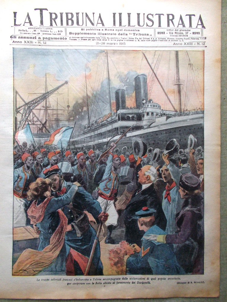 Le truppe coloniali francesi si imbarcano a Tolone accompagnate dalle acclamazioni di quel popolo entusiasta, per cooperare con le flotte alleate al forzamento dei Dardanelli (disegno di A. Minardi)