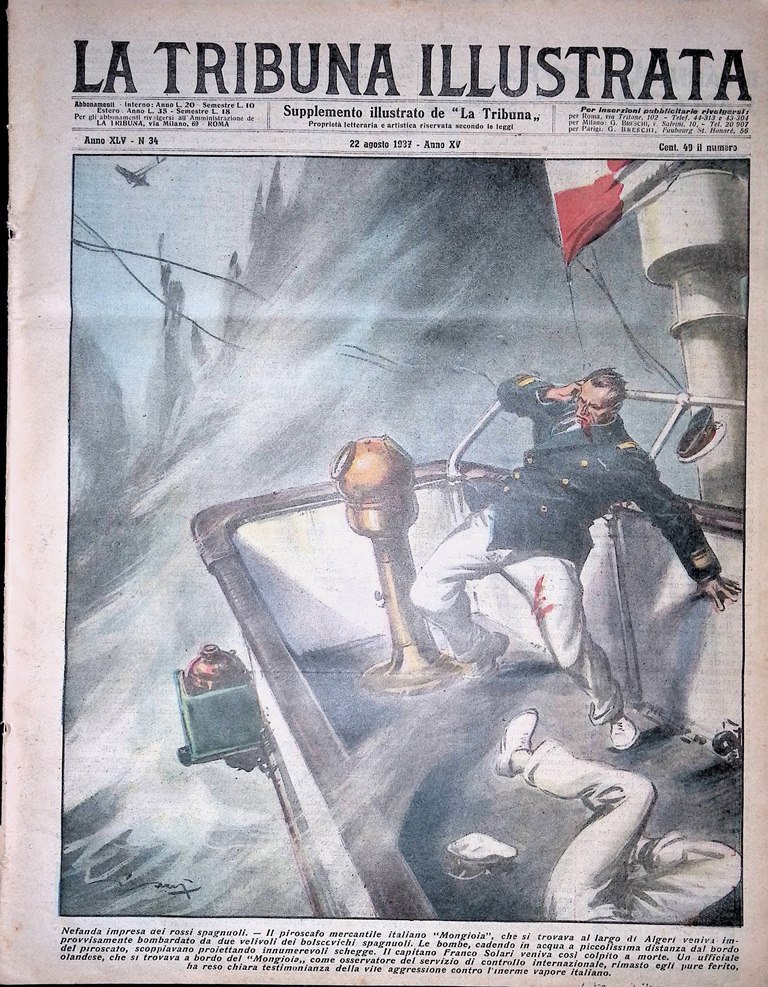 Il piroscafo mercantile italiano "Mongioia" che si trovava al largo di Algeri veniva improvvisamente bombardato da due velivoli dei bolscevichi spagnoli. Le bombe, cadendo in acqua a piccolissima distanza dal bordo del piroscafo, scoppiavano proiettando innumerevoli schegge. Il capitano Franco Solari veniva così colpito a morte. Un ufficiale olandese, che si trovava a bordo del mongioia come osservatore del servizio di controllo internazionale, rimasto egli pure ferito, ha reso chiara testimonianza della vile aggressione contro l'inerme vapore italiano (disegno di Vittorio Pisani)