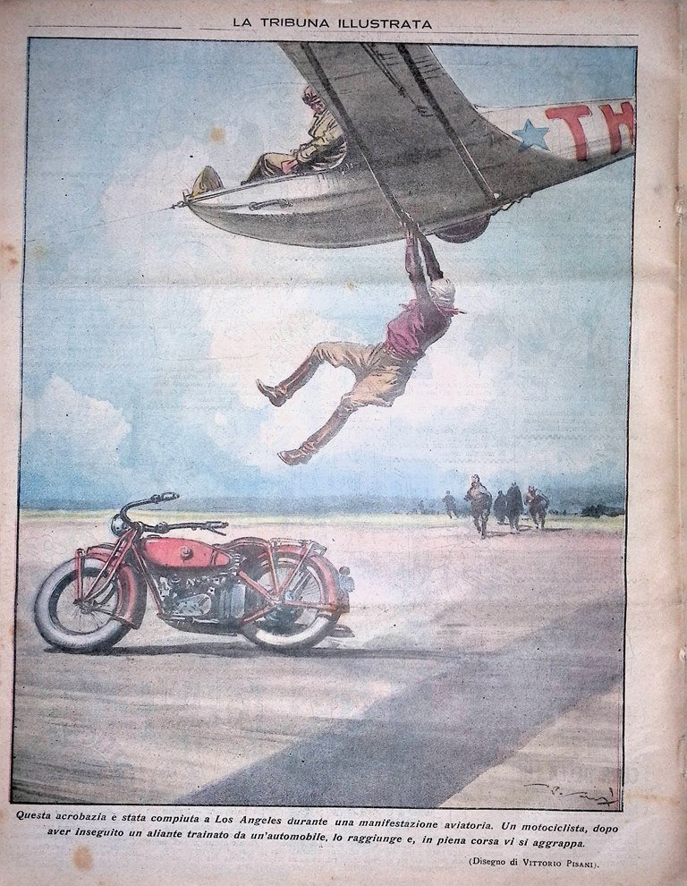 Questa acrobazia è stata compiuta a Los Angeles durante una manifestazione aviatoria. Un motociclista, dopo aver inseguito un aliante trainato da un'automobile, lo raggiunge e, in piena corsa, vi si aggrappa (disegno di Vittorio Pisani)