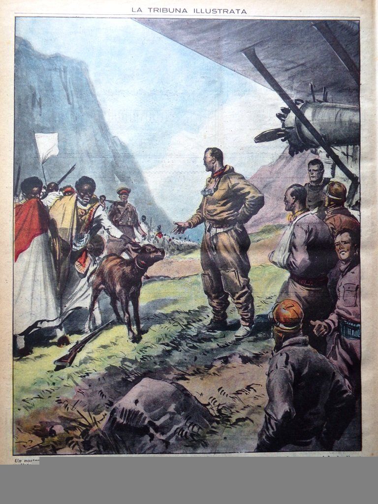 Menzogne etiopiche: un comunicato da Addis Abeba informava che, durante il bombardamento di Dessié compiuto dai nostri aeroplani, un giornalista francese era stato ferito da una scheggia d'una nostra bomba. Il giornalista ha invece smentito la notizia dichiarando che, durante il bombardamento, i soldati etiopici s'erano messi a sparare all'impazzata, e che uno d'essi, scambiando forse il francese per un nemico, l'aveva preso di mira colpendolo ad un ginocchio. Nel trambusto anche un'infermiera norvegese della Croce Rossa veniva travolta e si spezzava una gamba (disegno di Vittorio Pisani)