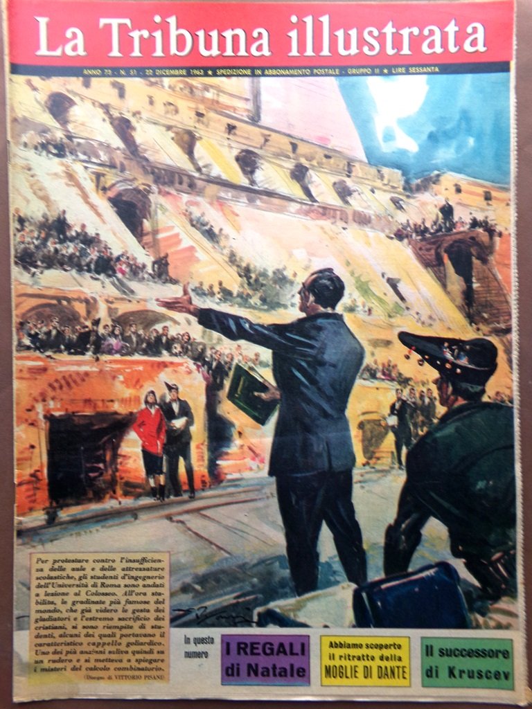 Per protestare contro l' insufficienza delle aule e delle attrezzature scolastiche, gli studenti d'ingegneria dell'Università di Roma sono andati a lezione al Colosseo. All'ora stabilita, le gradinate più famose del mondo, che già videro le gesta dei gladiatori e l'estremo sacrificio dei cristiani, si sono riempite di studenti, alcuni dei quali portavano il caratteristico cappello goliardico. Uno dei più anziani saliva quindi su un rudero e si metteva a spiegare i misteri del calcolo combinatorio (disegno di Vittorio Pisani)