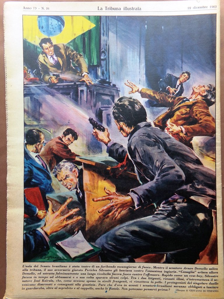 L'aula del Senato brasiliano è stata teatro di un furibondo mezzogiorno di fuoco. Mentre il senatore Arnon Demello saliva alla tribuna, il suo avversario giurato Pericles Silvestre gli lanciava contro l'ennesima ingiuria. "Canaglia" urlava allora Demello, ed estratta fulmineamente una lunga rivolteJla faceva fuoco contro l'offensore. Rapido come un cow-boy, Silvestre faceva in tempo ad abbassarsi e a sua volta sparava alcuni colpi. Tra i due litiganti, rimasti illesi, s'intrometteva il senatore ]osé Kairala, che, come avviene spesso in simili frangenti, ci rimetteva la pelle. I protagonisti del singolare duello venivano disarmati e consegnati alla giustizia. Pare che d'ora in avanti i senatori brasiliani saranno obbligati a lasciare in guardaroba, oltre al soprabito e al cappello, anche le pistole. Non potevano pensarci prima? (disegno di G. Di Stefano)