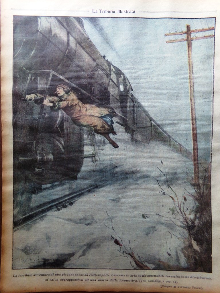 La terribile avventura di una giovane sposa ad Indianapolis. Lanciata in aria da un'automobile investita da un direttissimo si salva aggrappandosi ad una sbarra della locomotiva (disegno di Vittorio Pisani)