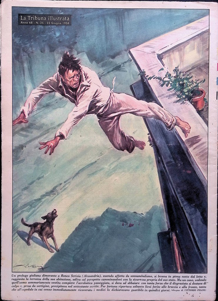 Un profugo giuliano dimorante a Ronco Scrivia (Alessandria), essendo affetto da sonnambulismo, si levava in piena notte dal letto e, raggiunta la terrazza della sua abitazione, saliva sul parapetto camminandovi con la sicurezza propria del suo stato. Ma un cane, vedendo quell'uomo sommariamente vestito compiere l'acrobatica passeggiata, si dava ad abbaiare con tanta forza che il disgraziato si destava di colpo e, preso da vertigine, precipitava nel sottostante cortile. Per fortuna riportava soltanto lievi ferite alle braccia e alla fronte, tanto che all'ospedale in cui venne immediatamente ricoverato i medici lo dichiaravano guaribile in quindici giorni.