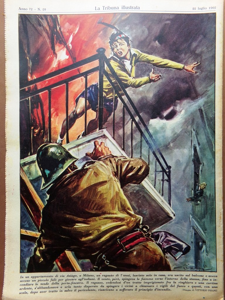 In un appartamento di via Asiago a Milano un ragazzo di 7 anni, lasciato solo in casa, era uscito sul balcone e aveva acceso un piccolo falò per giocare agli indiani. Il vento, però, spingeva le fiamme verso l'interno della stanza, fino a incendiare le tende della porta-finestra. Il ragazzo, vedendosi d'un tratto imprigionato fra la ringhiera e una cortina ardente, s'abbandonava a urla tanto disperate da spingere i vicini a chiamare i vigili del fuoco e questi, con una scala, dopo aver tratto in salvo il pericolante, riuscivano a soffocare il principio d'incendio (disegno di Vittorio Pisani)