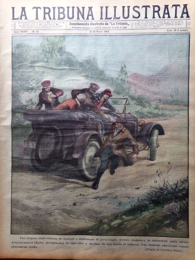 Una brigata anglosassone di studenti e studentesse di archeologia, mentre viaggiava in automobile sulla strada Arta-Cavasserà (Epiro meridionale) fu aggredita a fucilate da una banda di briganti. Uno studente americano rimase gravemente ferito (disegno di Vittorio Pisani)