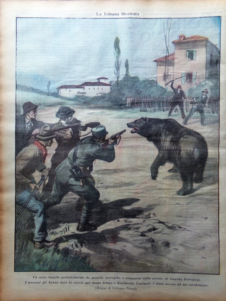Un orso, fuggito probabilmente da qualche serraglio, è comparso sulla piazza di Guarda Ferrarese. I paesano gli hanno dato la caccia per lungo tempo prima di trovarlo e ucciderlo (disegno di Vittorio Pisani)