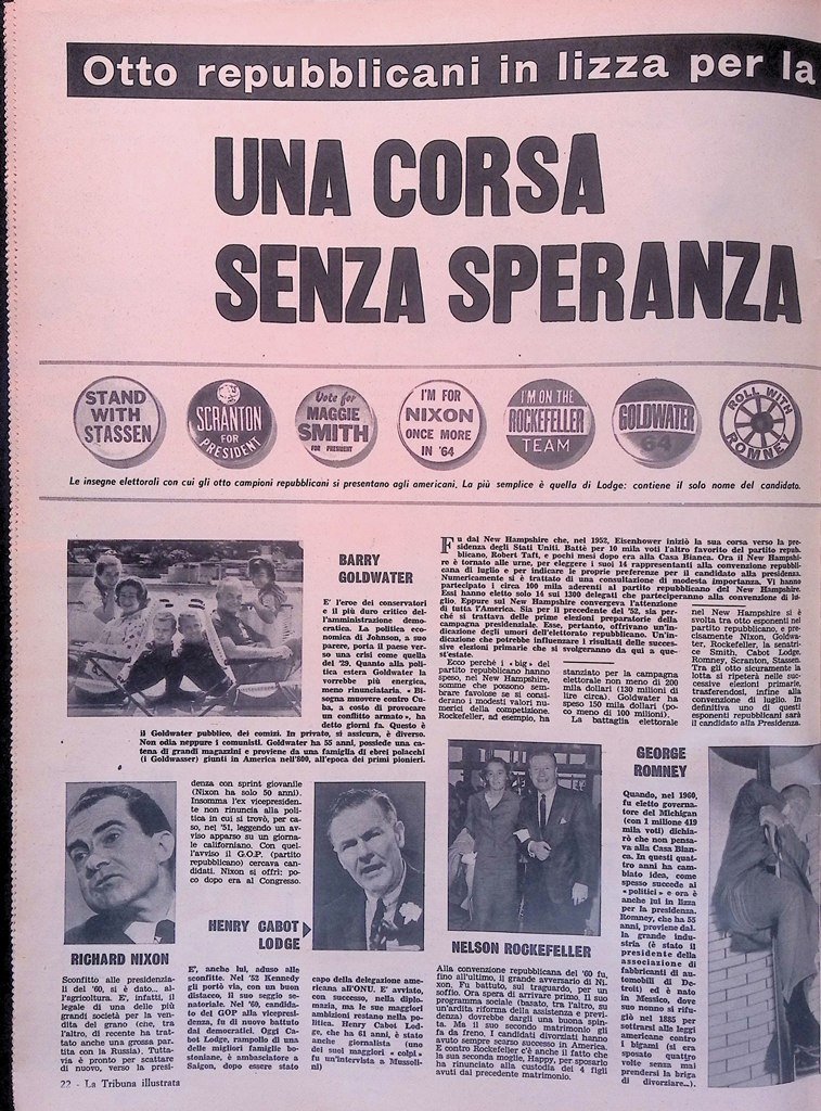 Otto repubblicani in lizza per la Casa Bianca: Richard Nixon, Henry Cabot Lodge, Barry Goldwater, Nelson Rockefeller, George Romney, Margareth Chase Smith, Harold Stassen e William Scranton