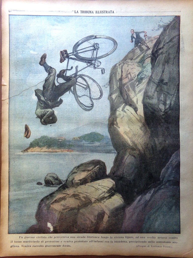 Un giovane ciclista che percorreva una strada lotorale lungo la riviera ligure, a una svolta urtava contro il basso muricciolo di protezione e precipitava nella sottostante scogliera riportando gravi ferite (disegno di Vittorio Pisani)