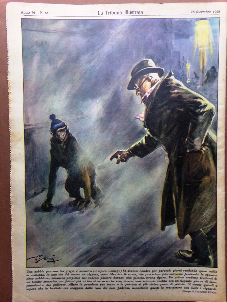 Una nebbia paurosa tra grigia e nerastra (il tipico smog) ha avvolto Londra per parecchi giorni rendendo quasi nulla la visibilità. In una via del centro un signore, certo Maurice Kreman, che procedeva faticosamente fendendo lo spessissimo nebbione, rimaneva perplesso nel vedersi passare davanti una piccola strana figura. Da prima credette trattarsi di un bimbo smarrito, ma fattosi più vicino si accorse che era, invece, una scimmia vestita con un'elegante giaccad i lana, pantaloni e due pullover (disegno di Vittorio Pisani)