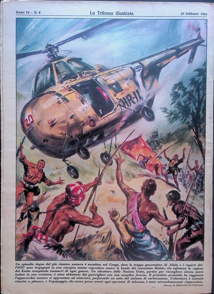 Un episodio degno del più classico western è accaduto nel Congo, dove le truppe governative di Adula e i reparti dell'ONU sono impegnati in una energica azione repressiva contro le bande del comunista Mulele, che infestano la regione del Kwilu compiendo massacri di ogni genere. Un elicottero delle Nazioni Unite, partito per raccogliere alcune suore isolate in una missione, è stato abbattuto dai guerriglieri con una semplice freccia. Il primitivo proiettile ha raggiunto l'apparecchio mentre si apprestava ad atterrare, perforando un tubo del sistema di carburazione. L'elicottero è tuttavia riuscito a planare, e l'equipaggio, che aveva perso ormai ogni speranza di salvezza, è stato miracolosamente risparmiato.