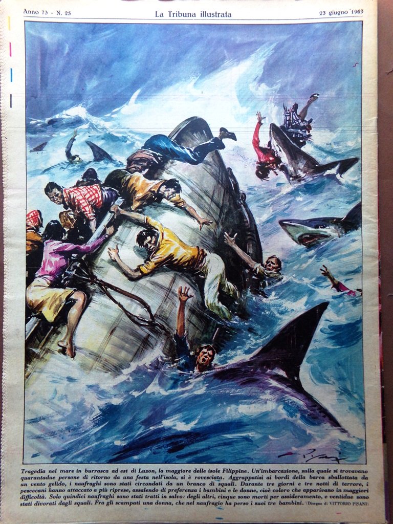 Tragedia nel mare in burrasca ad est di Luzon, la maggiore delle isole Filippine. Un'imbarcazione, sulla quale si trovavano quarantadue persone di ritorno da una festa nell'isola, si è rovesciata. Aggrappatisi ai bordi della barca sballottata da un vento gelido, i naufraghi sono stati circondati da un branco di squali. Durante tre giorni e tre notti di terrore, i pescecani hanno attaccato a più riprese, assalendo di preferenza i bambini e le donne, cioè coloro che apparivano in maggiori difficoltà. Solo quindici naufraghi sono stati tratti in salvo: degli altri, cinque sono morti per assideramento, e ventidue sono stati divorati dagli squali. Fra gli scampati una donna, che nel naufragio ha perso i suoi tre bambini (disegno di Vittorio Pisani)