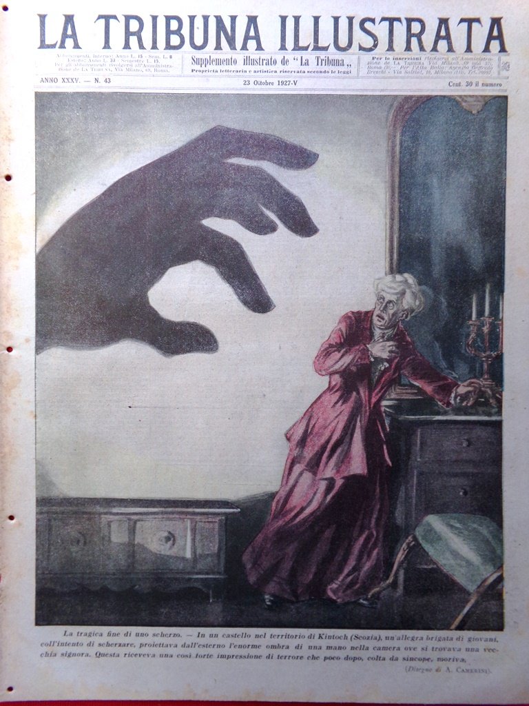 La tragica fine di uno scherzo. In un castello di Kintoch (Scozia) un'allegra brigata di giovani proiettava dall'esterno l'enorme ombra di una mano nella camera dove si trovava una vecchia signora che però moriva per lo spavento (disegno di Camerini)