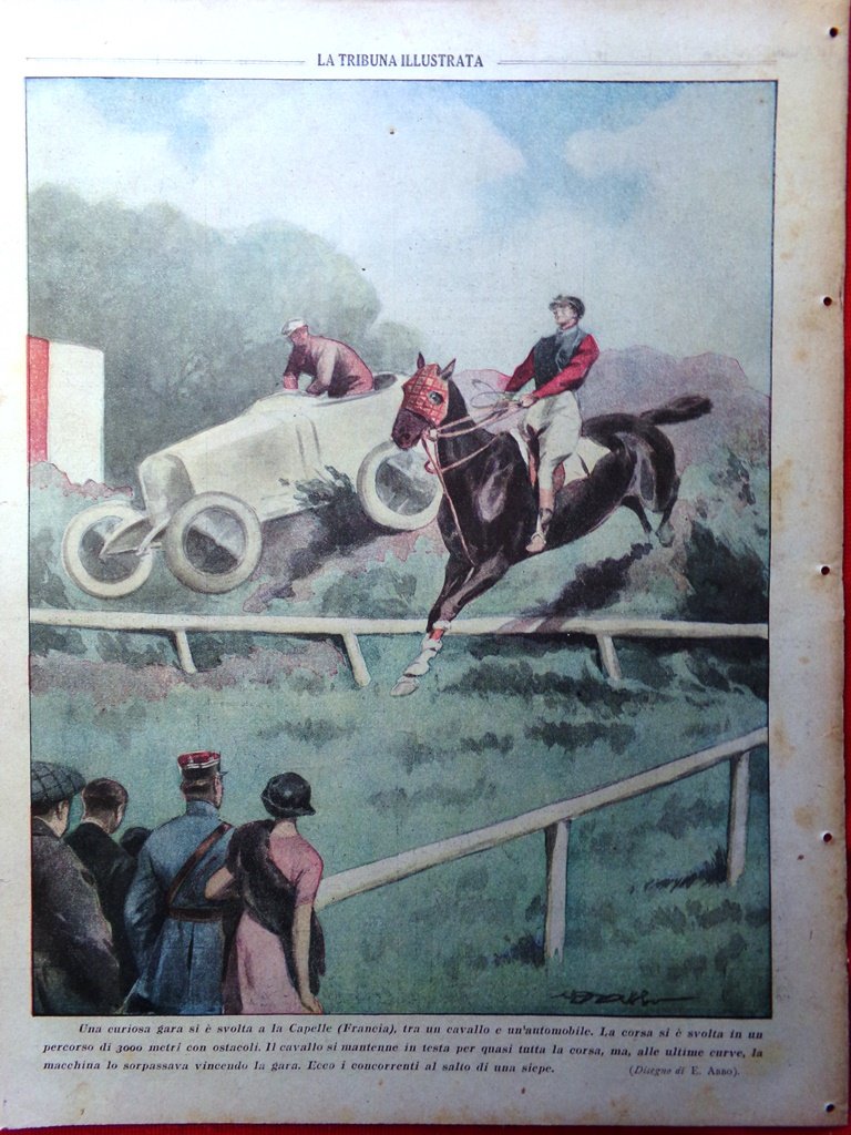 Una curiosa gara si è svolta a La Capelle (Francia) tra un cavallo e un'automobile. La corsa si è svolta in un percorso di 3 mila metri con ostacoli. Alla fine vinse la macchina (disegno di E. Asso)
