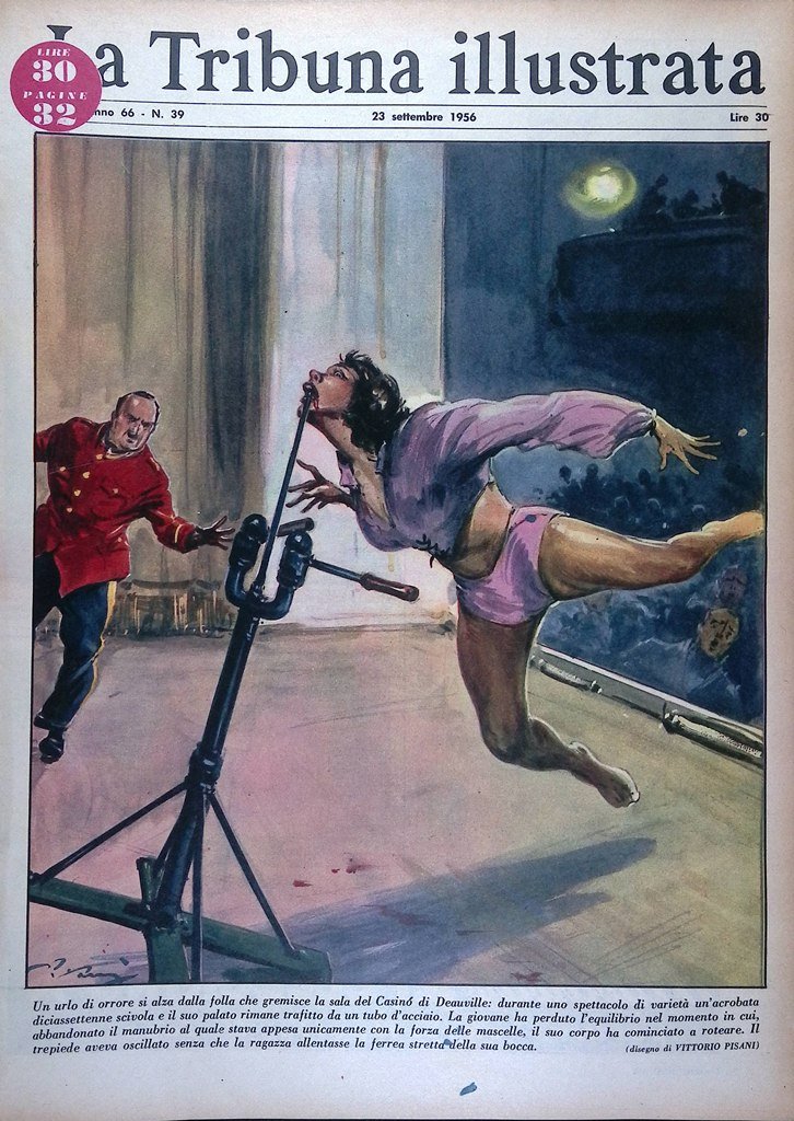 Un urlo di orrore si alza dalla folla che gremisce la sala del Casinò di Deauville: durante uno spettacolo di varietà un'acrobata diciassettenne scivola e il suo palato rimane trafitto da un tubo d'acciaio. La giovane ha perduto l'equilibrio nel momento in cui, abbandonato il manubrio al quale stava appesa unicamente con la forza delle mascelle, il suo corpo ha cominciato a roteare. Il trepiede aveva oscillato senza che la ragazza allentasse la ferrea stretta della sua bocca (disegno di Vittorio Pisani)