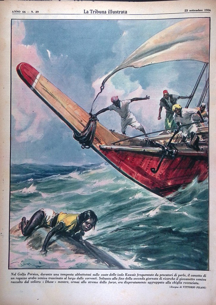 Nel Golfo Persico, durante una tempesta abbattutasi sulle coste delle isole Kuwait, frequentate da pescatori di perle, il canotto di un ragazzo arabo veniva trascinato al largo dalle correnti. Soltanto alla fine della seconda giornata di ricerche il giovanetto veniva raccolto dal veliero "Dhow" mentre, ormai allo stremo delle forze, era disperatamente aggrappato alla chiglia rovesciata (disegno di Vittorio Pisani)