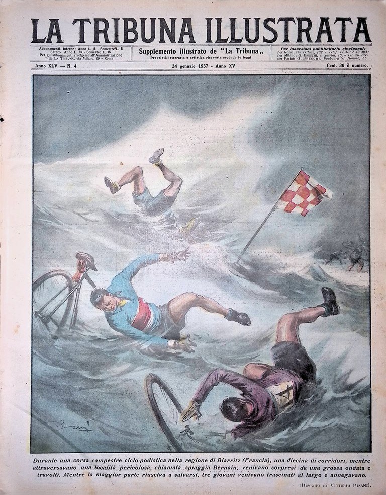 Durante una corsa campestre ciclo-podistica nella regione di Biarritz (Francia) una decina di corridori mentre attraversavano una località pericolosa, chiamata spiaggia Bernain, venivano sorpresi da una grossa ondata e travolti. Mentre la maggior parte riusciva a salvarsi, tre giovani venivano trascinati al largo e annegavano (disegno di Vittorio Pisani)