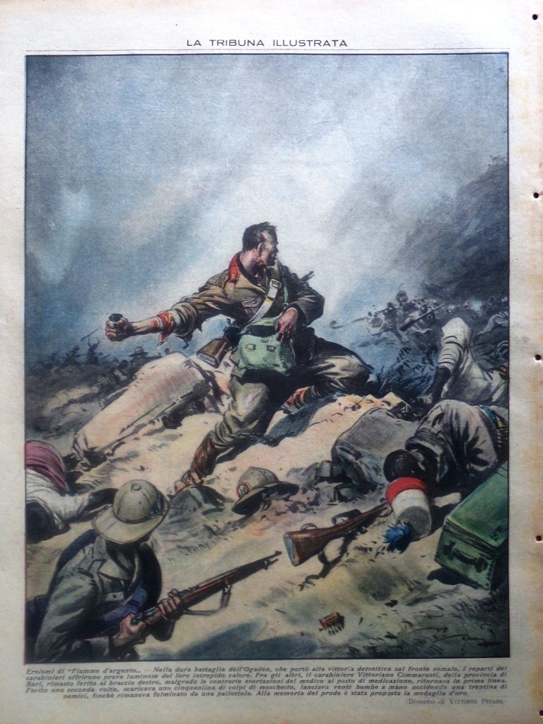 Nella dura battaglia dell'Ogaden, che portò alla vittoria definitiva sul fronte somalo, i reparti dei carabinieri offrirono prove luminose del loro intrepido valore. Fra gli altri il carabiniere Vittoriano Cimmarusti, della provincia di Bari, rimasto ferito al braccio destro, malgrado le contarrie esortazioni del medico al posto di medicazione, ritornava in prima linea. Ferito una seconda volta, scaricava una cinquantina di colpi di moschetto, lanciava venti bombe a mano uccidendo una trentina di nemici, finché rimaneva fulminato da una pallottola. Alla memoria del prode è stata proposta la medaglia d'oro (disegno di Vittorio Pisani)
