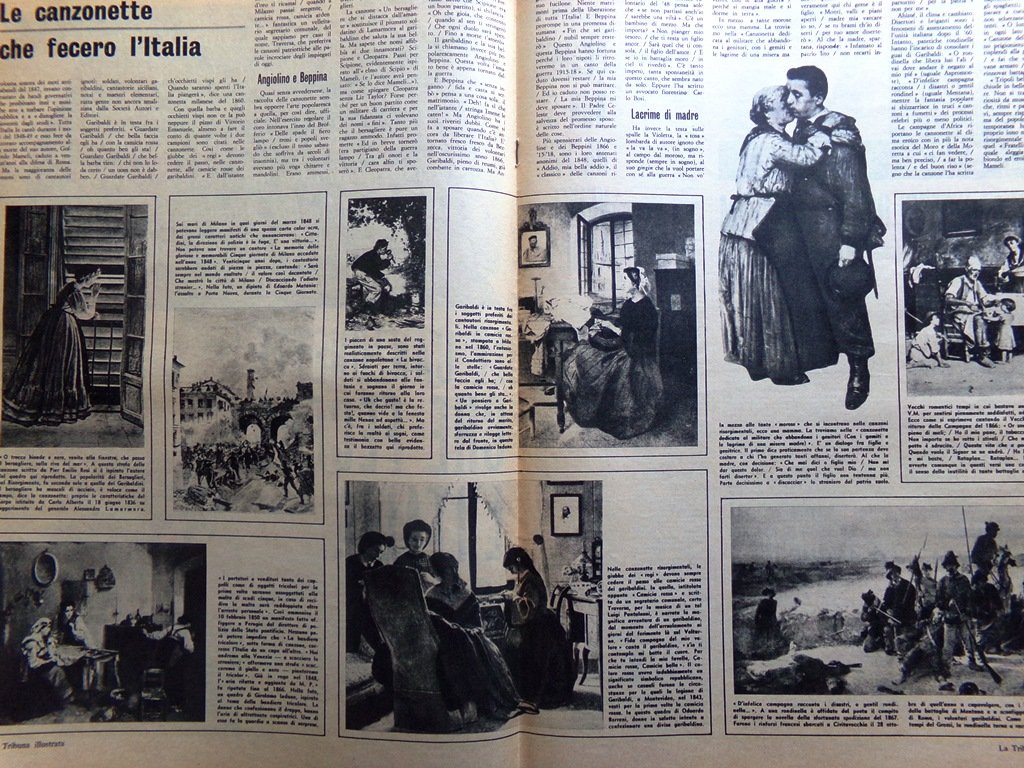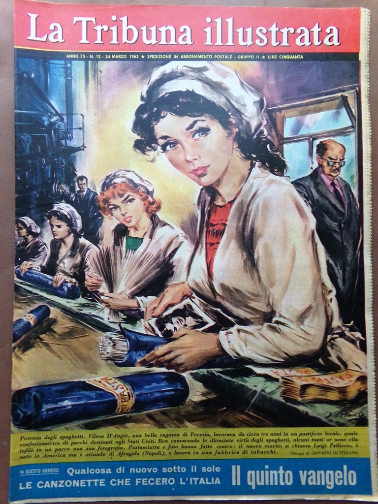 Potenza degli spaghetti. Vilma D'Angiò, una bella ragazza di Formia, lavorava da circa tre anni in un pastificio locale, quale confezionatrice di pacchi destinati agli Stati Uniti. Ben conoscendo le illimitate virtù degli spaghetti, alcuni mesi or sono ella infilò in un pacco una sua fotografia. Pastasciutta e foto hanno fatto centro: il nuovo marito si chiama Luigi Pelliccio, è nato in America ma è oriundo di Afragola (Napoli), e lavora in una fabbrica di tabacchi (disegno di G. Di Stefano)