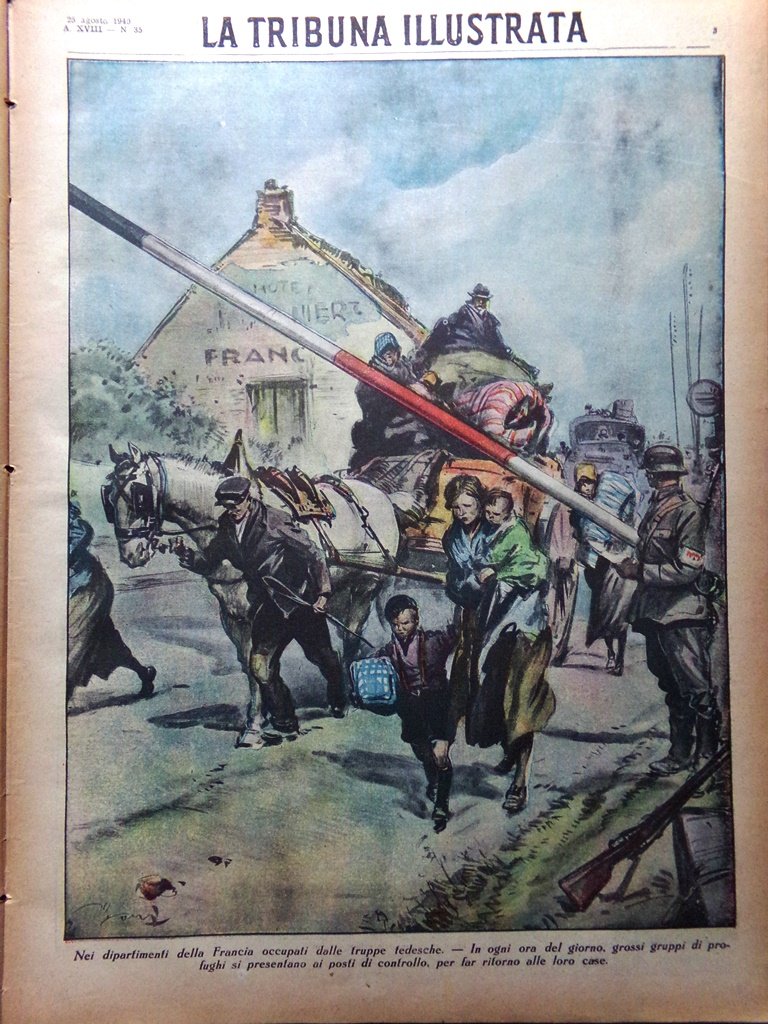 Nei dipartimenti della Francia occupati dalle truppe tedesche. In ogni ora del giorno, grossi gruppi di profughi si presentano ai posti di controllo, per far ritorno alle loro case (disegno di Vittorio Pisani)