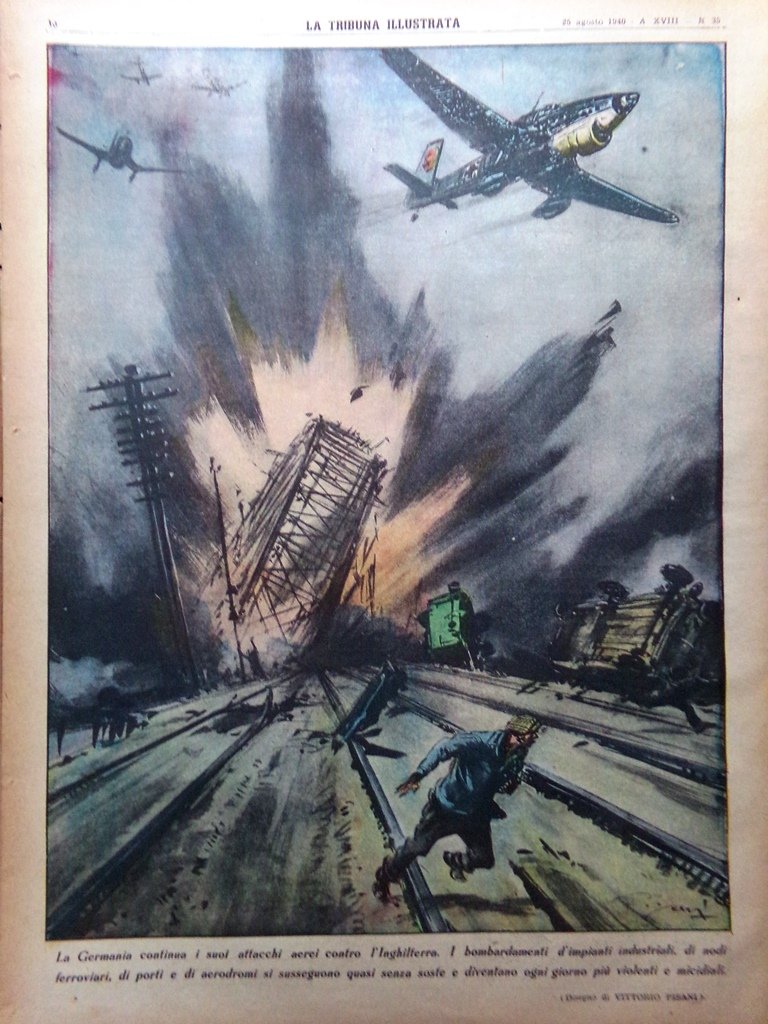 La Germania continua con i suoi attacchi aerei contro l'Inghilterra. I bombardamenti d'impianti industriali, di noti ferroviari, di porti e aerodromi si susseguono quasi senza soste e diventano ogni giorno più violenti e micidiali (disegno di Vittorio Pisani)