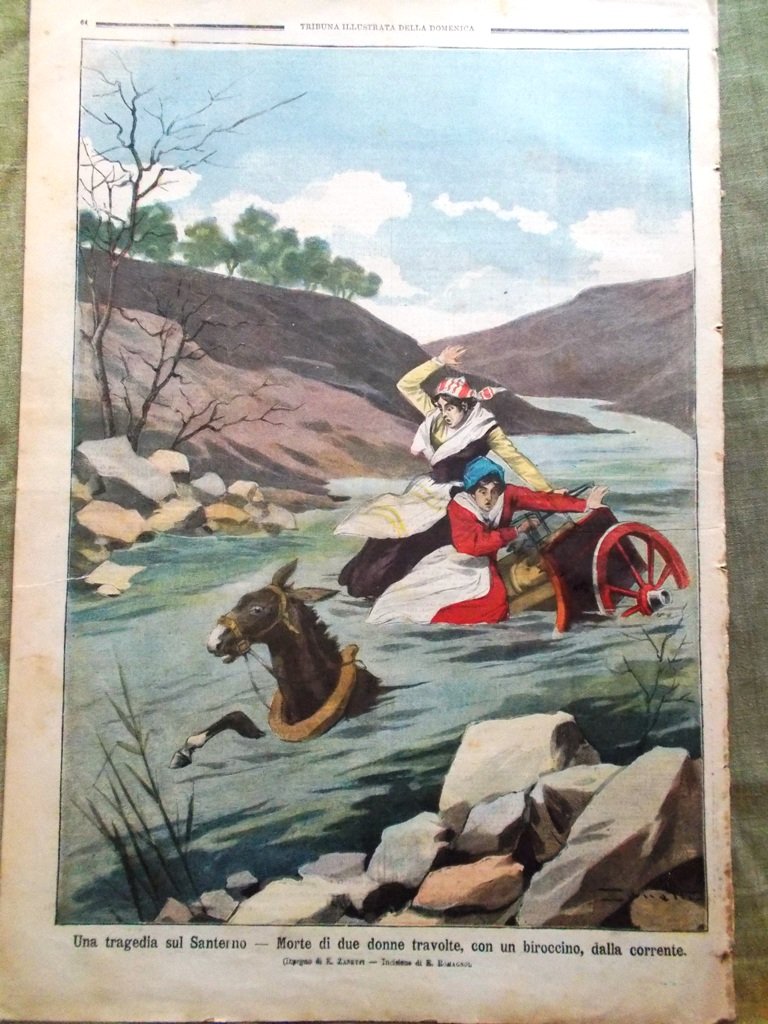 Una tragedia sul Santerno: morte di due donne travolte con un biroccino dalla corrente (disegno di Zanetti)