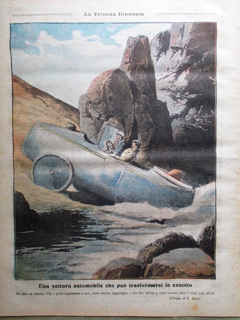 Una vettura automobile che può trasformarsi in canotto: ha fatto ad Atlantic City i primi esperimenti e può, come vettura, raggiungere i 100 km all'ora e, come canotto, filare i venti nodi all'ora (disegno di E. Abbo)