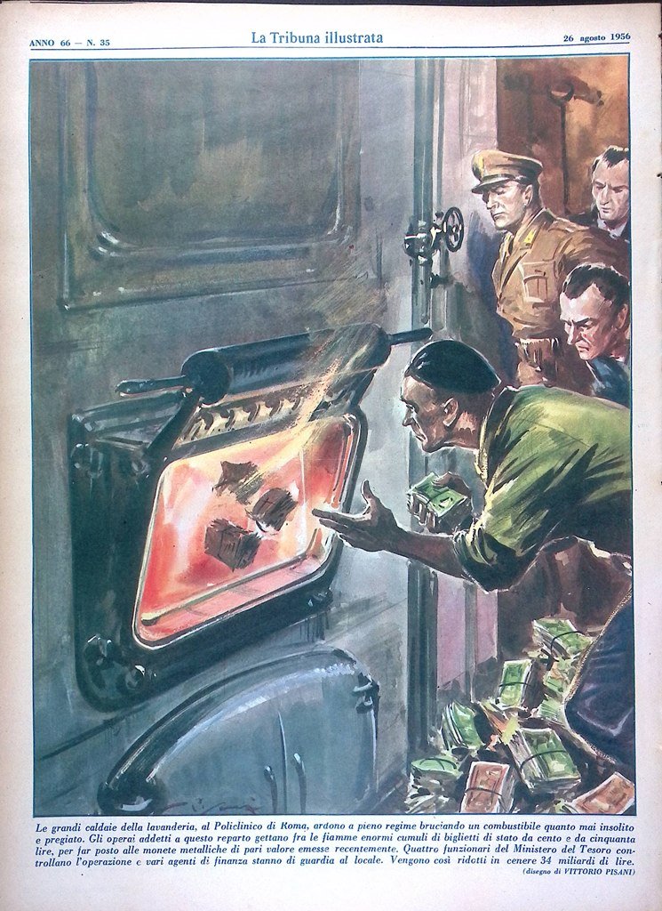 Le grandi caldaie della lavanderia, al Policlinico di Roma, ardono a pieno regime bruciando un combustibile quanto mai insolito e pregiato. Gli operai addetti a questo reparto gettano fra le fiamme enormi cumuli di biglietti di stato da cento e da cinquanta lire, per far posto alle monete metalliche di pari valore emesse recentemente. Quattro funzionari del Ministero del Tesoro controllano l'operazione e vari agenti di finanza stanno di guardia al locale. Vengono così ridotti in cenere 34 miliardi di lire (disegno di Vittorio Pisani)