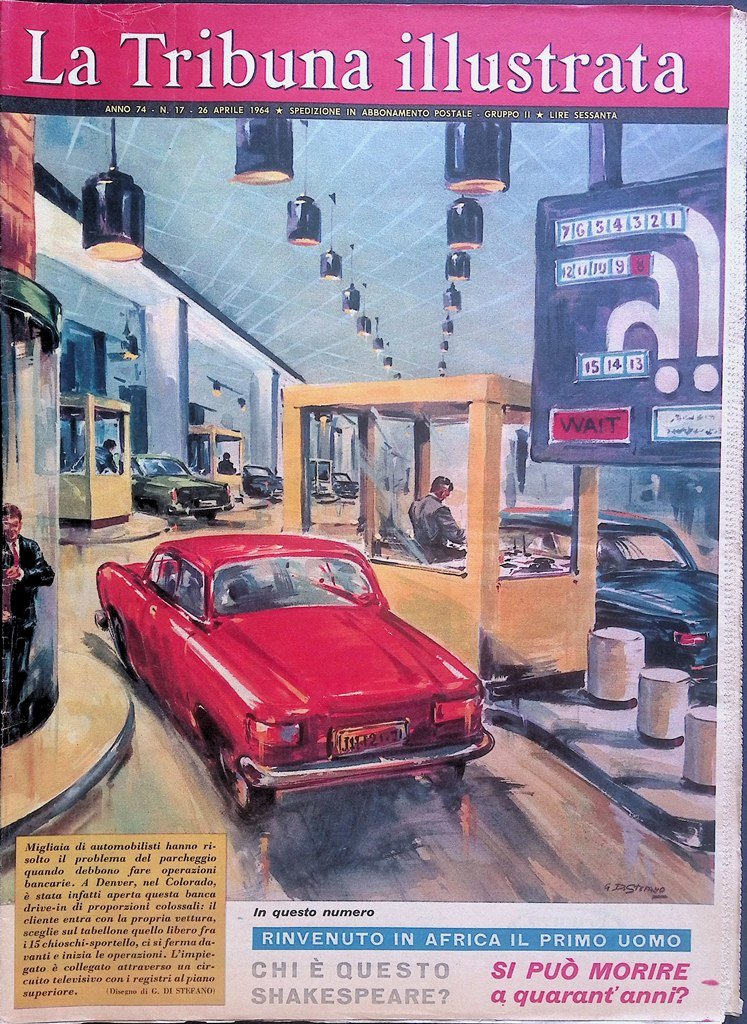 Migliaia di automobilisti hanno risolto il problema del parcheggio quando debbono fare operazioni bancarie. A Denver, nel Colorado, è stata infatti aperta questa banca drive-in di proporzioni colossali: il cliente entra con la propria vettura, sceglie sul tabellone quello libero fra i 15 chioschi-sportello, ci si ferma davanti e inizia le operazioni. L'impiegato è collegato attraverso un circuito televisivo con i registri al piano superiore.