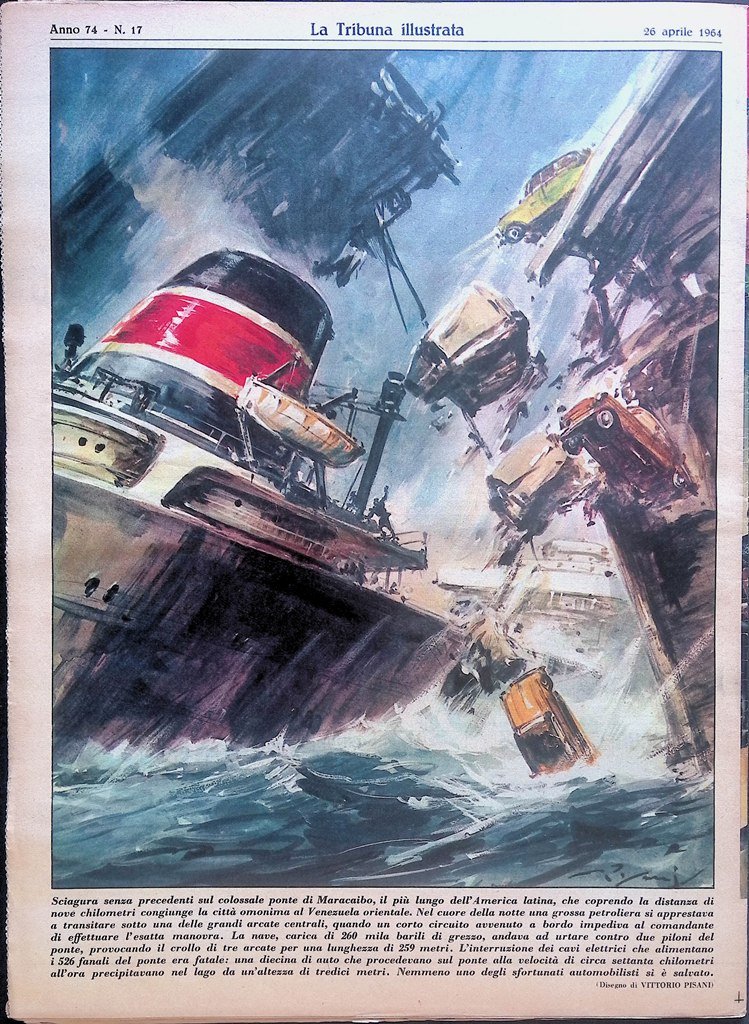 Sciagura senza precedenti sul colossale ponte di Maracaibo, il più lungo dell'America latina, che coprendo la distanza di nove chilometri congiunge la città omonima al Venezuela orientale. Nel cuore della notte una grossa petroliera si apprestava a transitare sotto una delle grandi arcate centrali, quando un corto circuito avvenuto a bordo impediva al comandante di effettuare l'esatta manovra. La nave, carica di 260 mila barili di grezzo, andava ad urtare contro due piloni del ponte, provocando il crollo di tre arcate per una lunghezza di 259 metri. L'interruzione dei cavi elettrici che alimentano i 526 fanali del ponte era fatale: una diecina di auto che procedevano sul ponte alla velocità di circa settanta chilometri all'ora precipitavano nel lago da un'altezza di tredici metri. Nemmeno uno degli sfortunati automobilisti si è salvato.