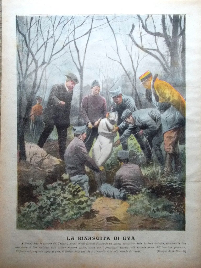 A Donai, dopo la cacciata dei tedeschi, alcuni soldati francesi rimettono in luce una statua di Eva dello scultore Rodin (disegno di A. Minardi)