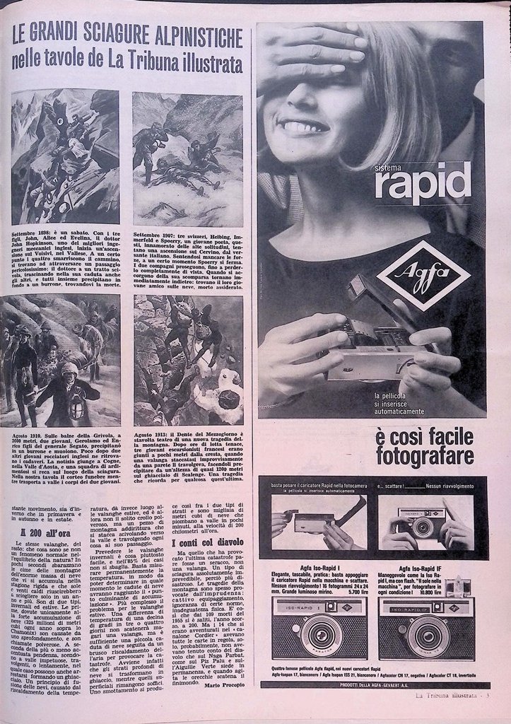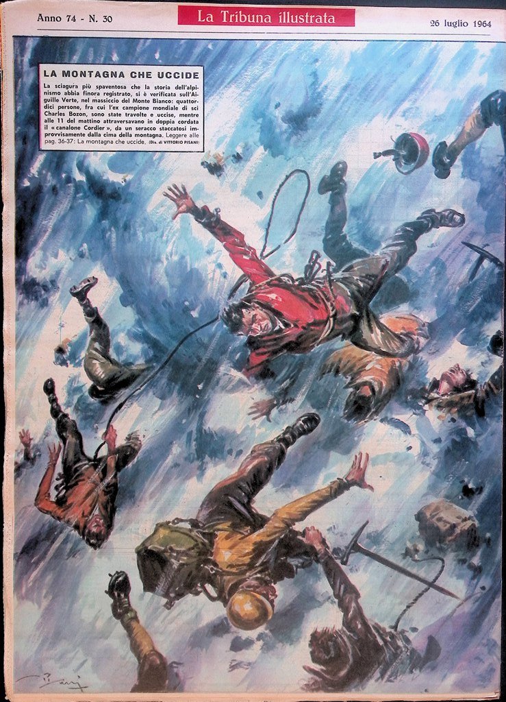 La sciagura più spaventosa che la storia dell'alpinismo abbia finora registrato, si è verificata sull'Aiguille Verte, nel massiccio del Monte Bianco: quattordici persone, fra cui l'ex campione mondiale di sci Charles Bozon, sono state travolte e uccise, mentre alle 11 del mattino attraversavano in doppia cordata il « canalone Cordier », da un seracco staccatosi improvvisamente dalla cima della montagna.