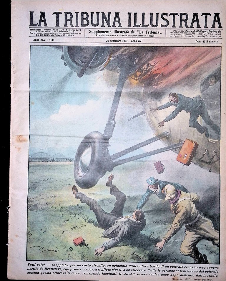 Tutti salvi. Scoppiato, per un corto circuito, un principio d'incendio a bordo di un velivolo cecoslovacco appena partito da Bratislava, con pronta manovra il pilota riusciva ad atterrare. Tutte le persone si lanciavano dal velivolo appena questo sfiorava la terra, rimanendo incolumi. Il velivolo invece veniva poco dopo distrutto dall'incendio (disegno di Vittorio Pisani)