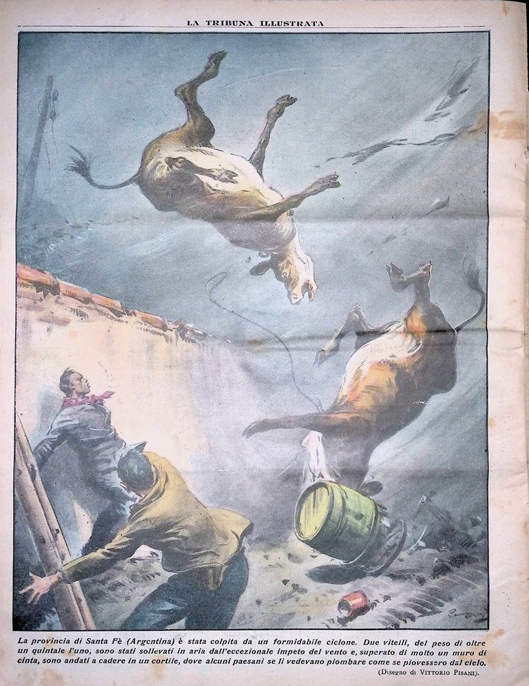 La provincia di Santa Fè (Argentina) è stata colpita da un formidabile ciclone. Due vitelli, del peso di oltre un quintale l'uno, sono stati sollevati in aria dall'eccezionale impeto del vento e, superato di molto un muro di cinta, sono andati a cadere in un cortile, dove alcuni paesani se li vedevano piombare come se piovessero dal cielo (disegno di Vittorio Pisani)