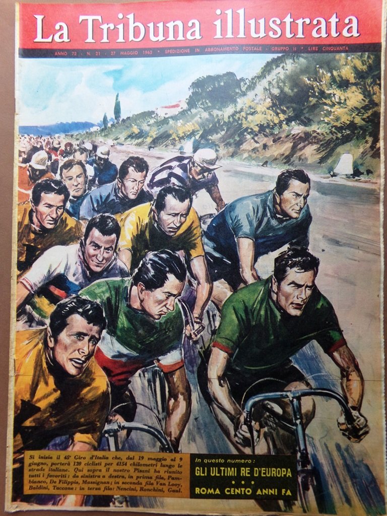 Si inizia il 45° Giro d'Italia che, dal 19 maggio al 9 giugno, porterà 120 ciclisti per 4154 chilometri lungo le strade italiane. Qui sopra il nostro Pisani ha riunito tutti i favoriti: Pambianco, De Filippis, Massignan, Van Looy, Baldini, Taccone, Nencini, Ronchini, Gaule (disegno di Vittorio Pisani)