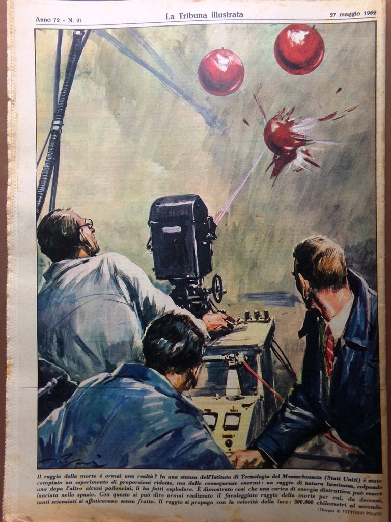 Il raggio della morte è ormai una realtà? In una stanza dell'Istituto di Tecnologia del Massachussets (Stati Uniti) è stato compiuto un esperimento di proporzioni ridotte, ma dalle conseguenze enormi: un raggio di natura luminosa, colpendo uno dopo l'altro alcuni palloncini, li ha fatti esplodere. È dimostrato così che una carica di energia distruttiva può essere lanciata nello spazio. Con questo si può dire ormai realizzato il favoleggiato raggio della morte per cui, da decenni, tanti scienziati si affaticavano senza frutto. Il raggio si propaga con la velocità della luce: 300.000 chilometri al secondo (disegno di Vittorio Pisani)