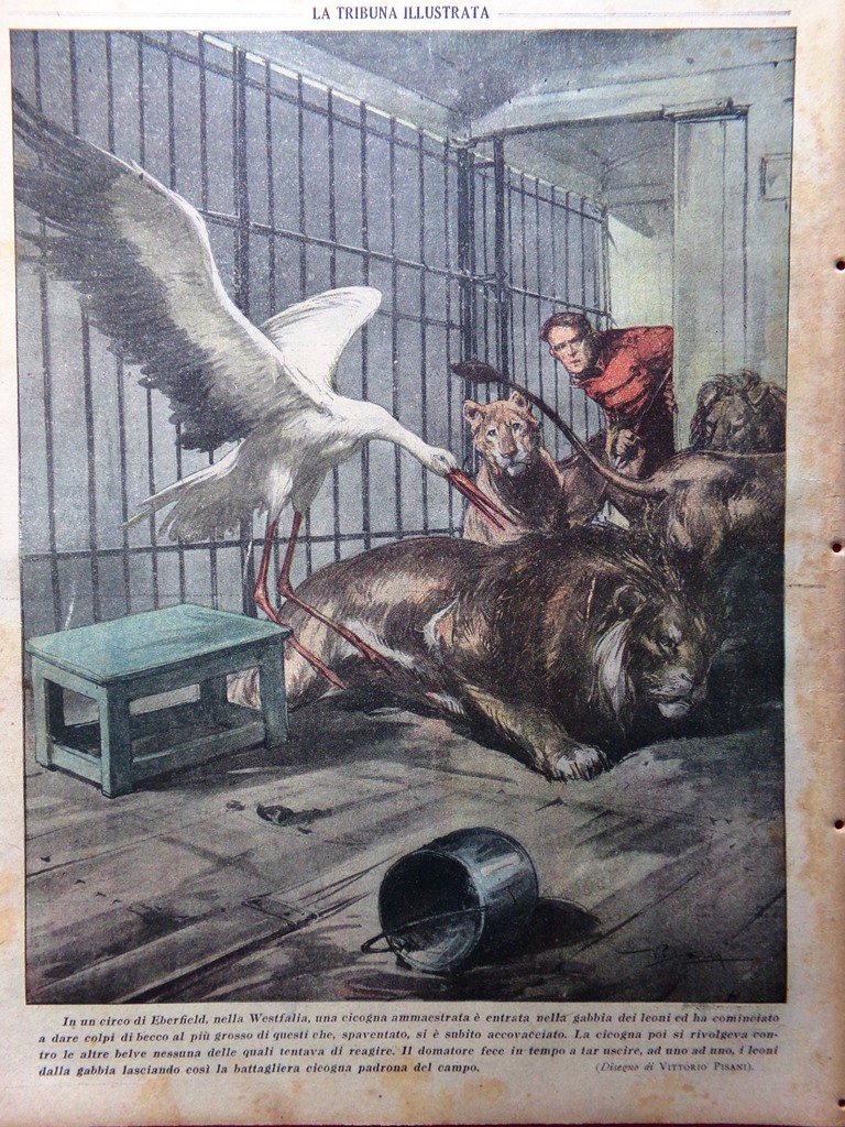 In un circo di Eberfield, nella Westfalia, una cicogna ammaestrata è entrata nella gabbia dei leoni e ha cominciato a beccare il più grosso di questi. Il domatore fece in tempo a far uscire i leoni uno a uno lasciando nella gabbia il pennuto (disegno di Vittorio Pisani)