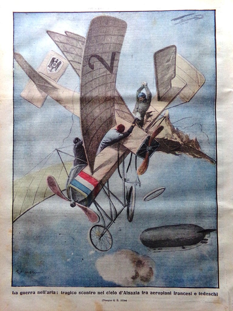 La guerra nell'aria: tragico scontro nel cielo d'Alsazia fra aeroplani francesi e tedeschi (E. Abbo)