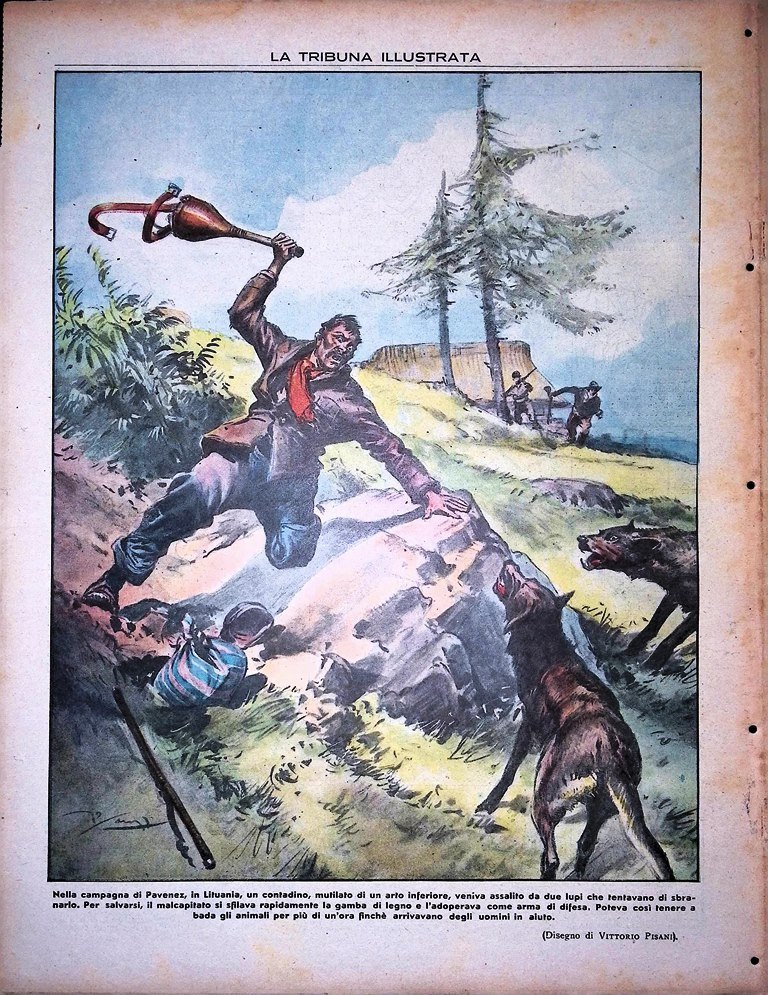 Nella campagna di Pavenez, in Lituania, un contadino, mutilato di un arto inferiore, veniva assalito da due lupi. Per salvarsi si sfilava la gamba di legno e l'adoperava come arma di difesa, fino all'arrivo dei soccorsi (disegno di Vittorio Pisani)