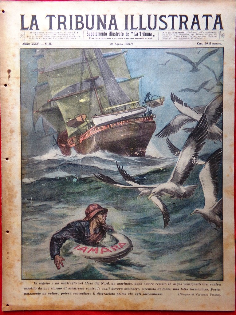 In seguito a un naufragio nel Mare del Nord, un marinaio rimasto in acqua 24 ore, veniva assalito da uno stormo di albatros contro il quale doveva lottare. Fortunatamente fu raccolto da un veliero prima che soccombesse (disegno di Vittorio Pisani)