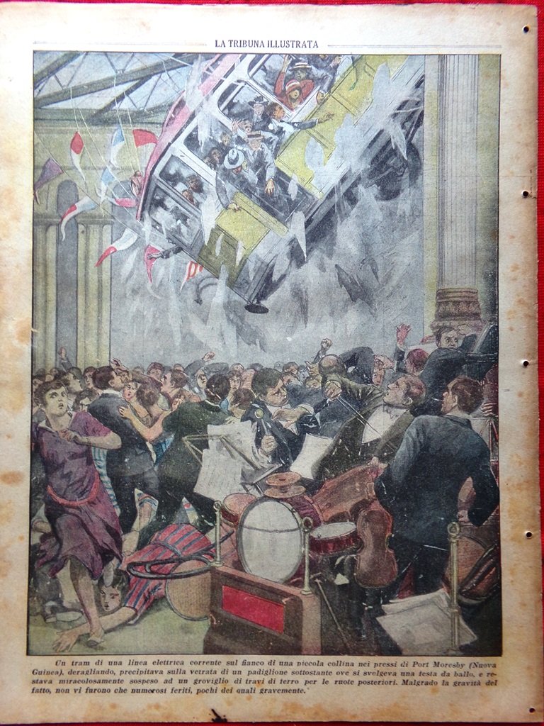 Un tram di una linea elettrica nei pressi di Port Moresby (Nuova Guinea) deragliando precipitava sulla vetrata di un padiglione sottostante. Per fortuna solo numerosi feriti ma nessuna vittima (disegno di Vittorio Pisani)